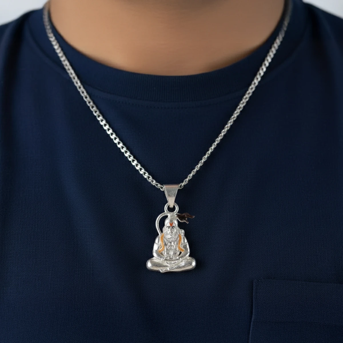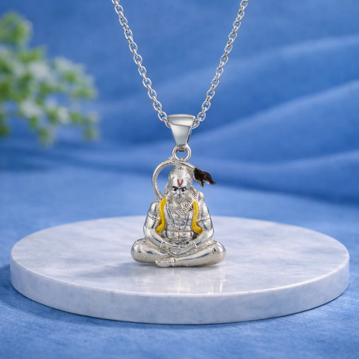 The Hanumān Rūpyaka pendant is finely crafted from pure silver, featuring intricate detailing that reflects divine strength and devotion. Subtle highlights in gold or yellow enamel accentuate the chest and forehead, adding depth and spiritual radiance. A perfect blend of artistry, faith, and elegance.