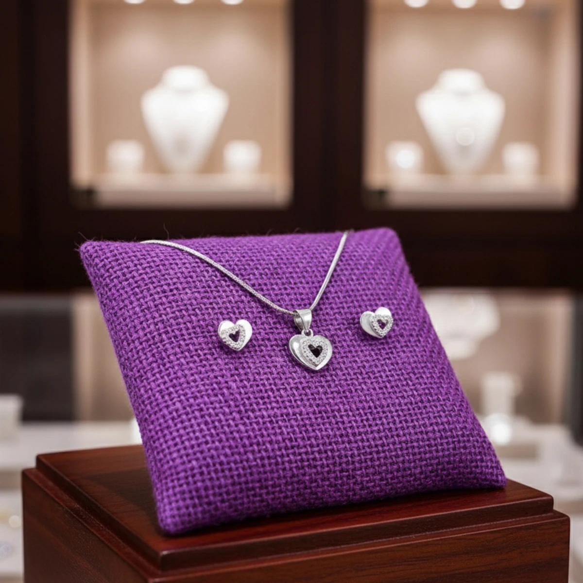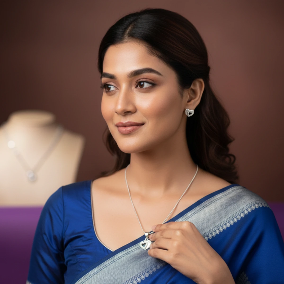 The Hṛdayajhaṅkā set is a beautifully crafted sterling silver pendant and earring duo that embodies refined elegance. Each piece features an open-heart design adorned with brilliant-cut cubic zirconia, radiating timeless charm and sparkle. Perfect for expressing love and sophistication on any occasion.