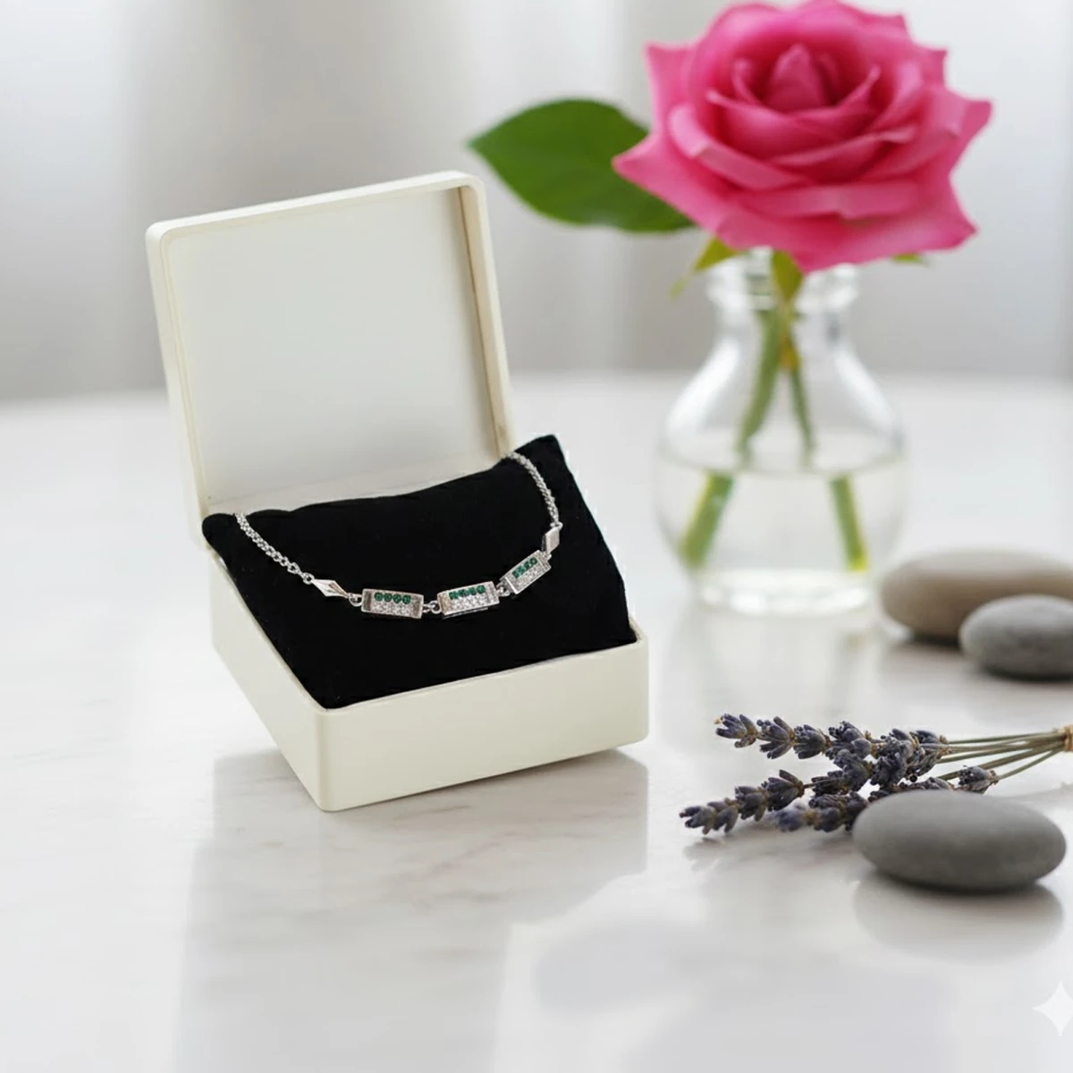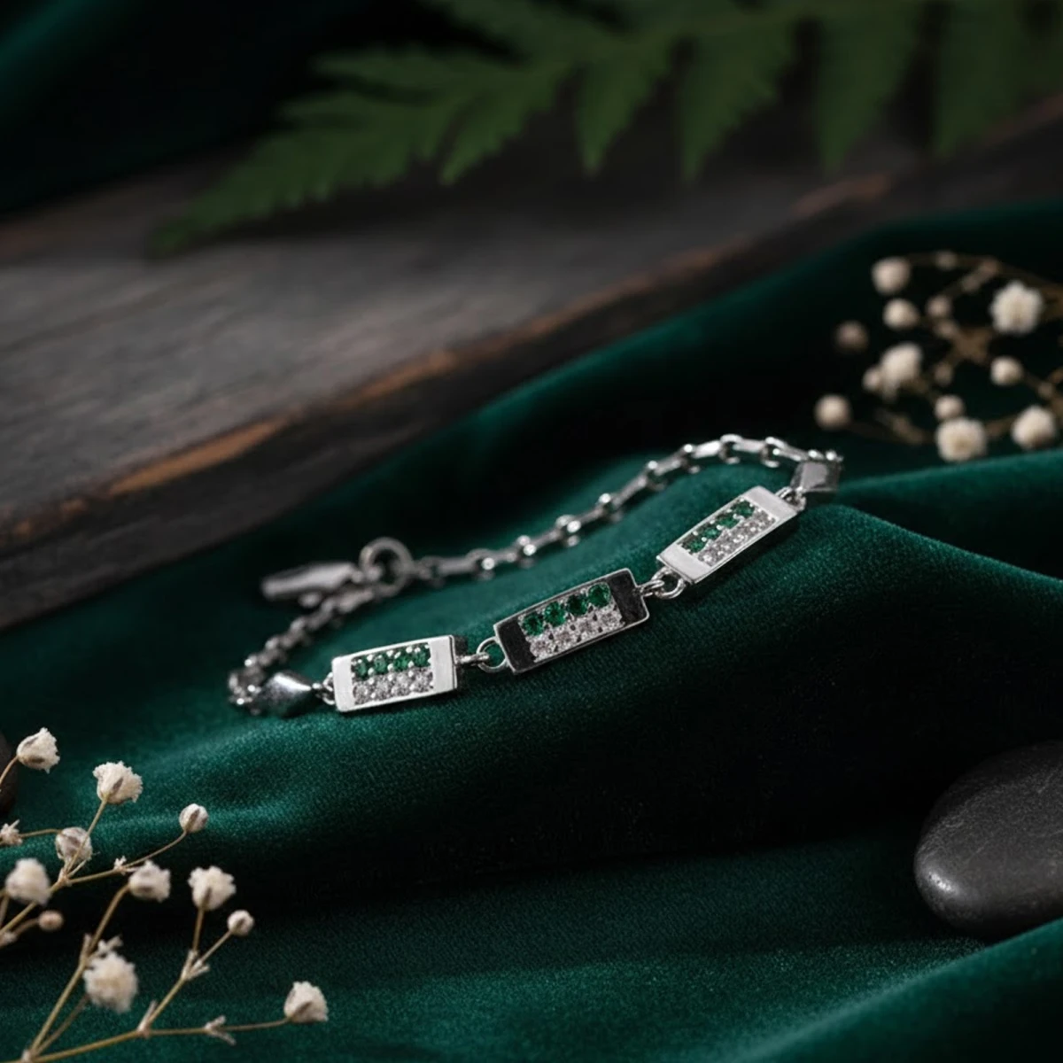 The Himavalaya bracelet showcases a refined silver-toned design featuring three bold rectangular links at the center. The chain transitions into a series of interconnected diamond-shaped links, creating a delicate yet contemporary aesthetic. A perfect blend of structure, style, and sophistication.