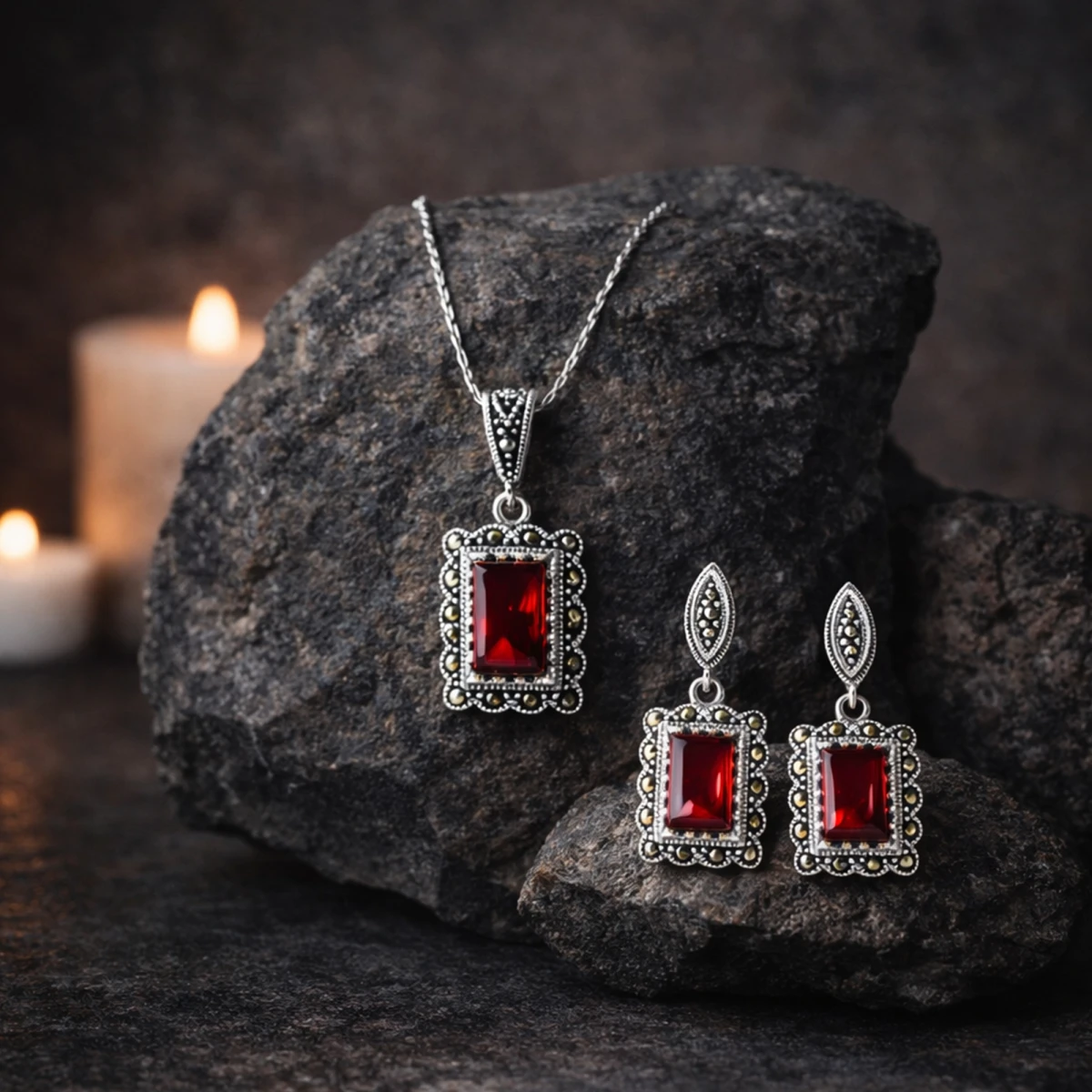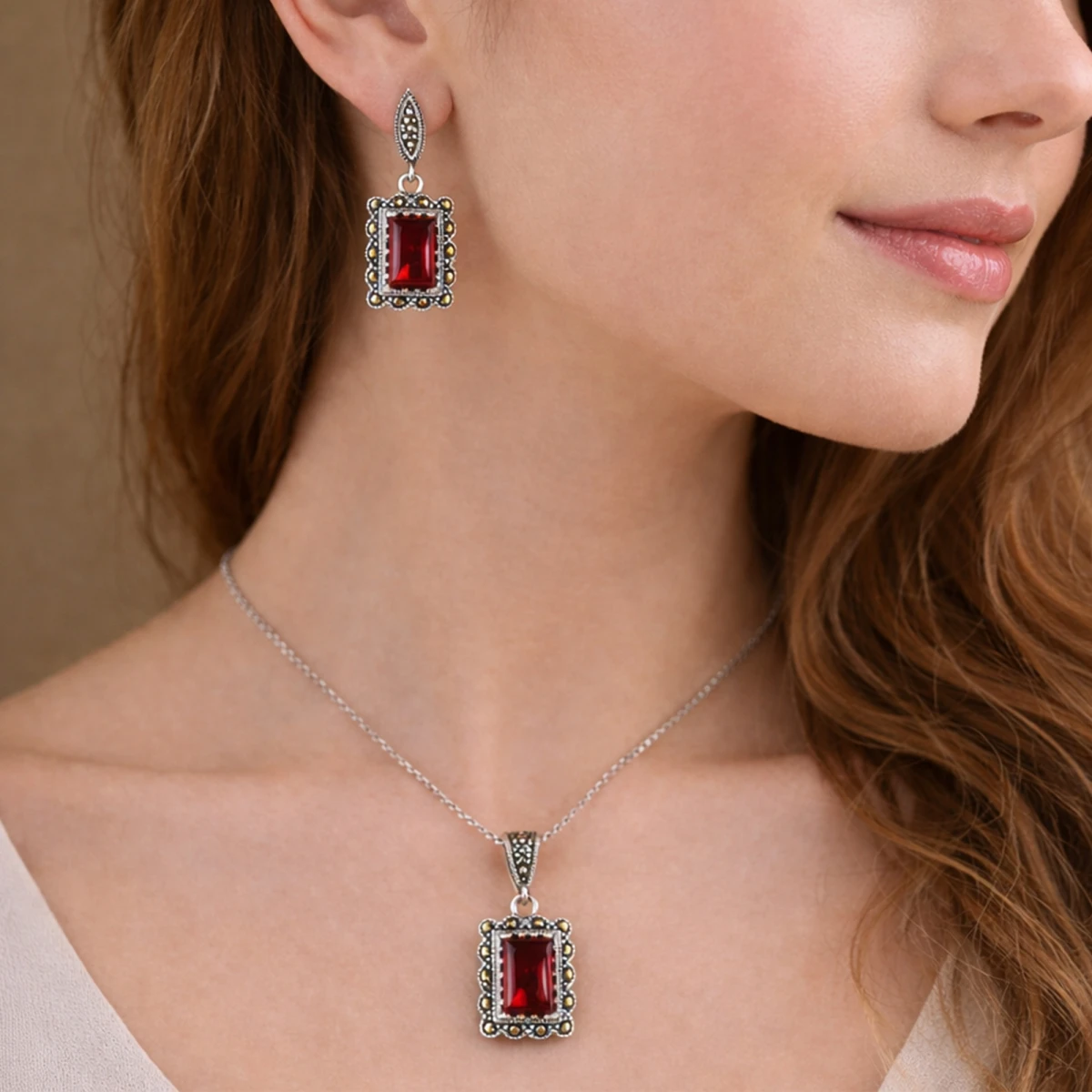 The Kalāpadī pendant set features a radiant red stone framed in an elegant square design. Crafted in silver with intricate filigree borders, the pendant is paired with matching drop earrings that echo its detailed artistry. A perfect fusion of tradition, color, and timeless beauty.