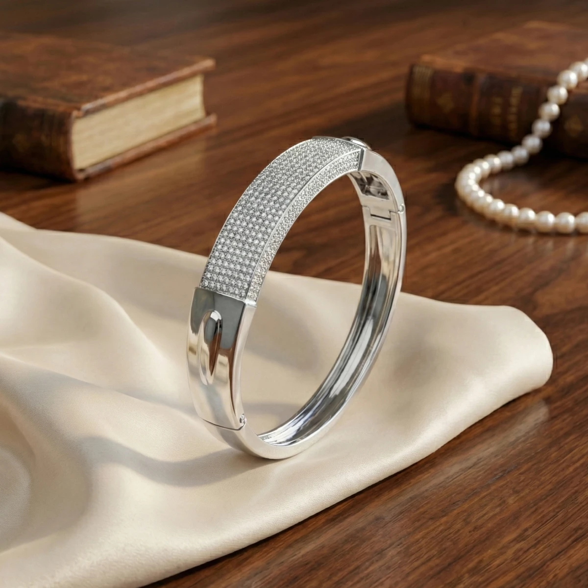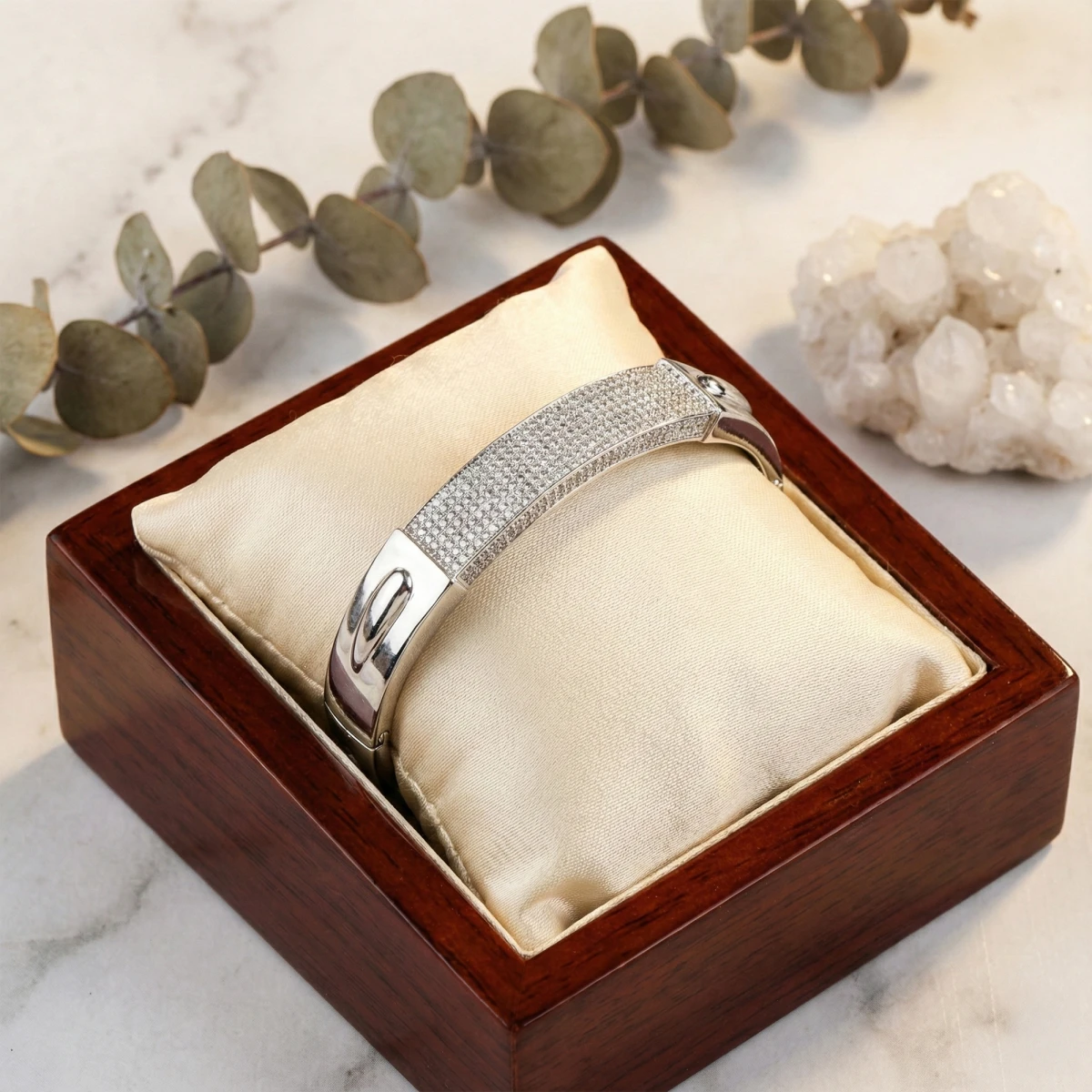 The Kalpavalaya bracelet exudes modern elegance with its sleek silver design and half-paved surface adorned with sparkling cubic zirconia stones. Each facet catches the light beautifully, adding effortless glamour to any look. A perfect blend of sophistication and contemporary charm.