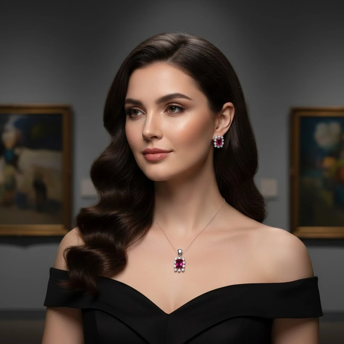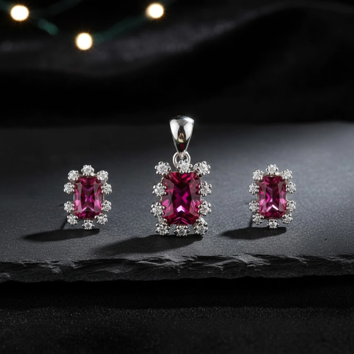 The Māṇikya set showcases a radiant ruby at its center, encircled by a dazzling halo of shimmering white stones that enhance its deep, rich hue. Paired with matching stud earrings, this elegant set adds a touch of timeless glamour and sophistication to any outfit.