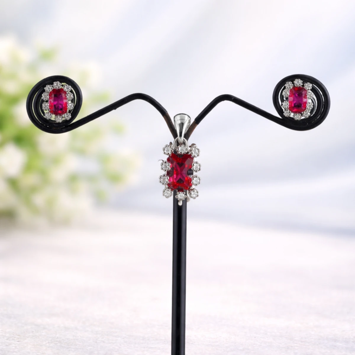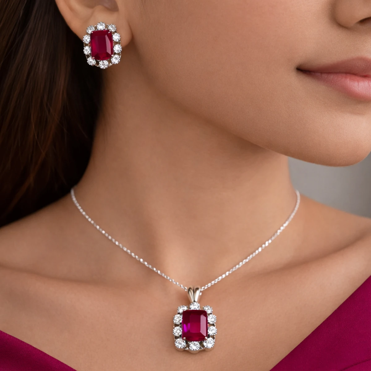 Inspired by the deep hues of a sunset, this set captures the essence of passion. Each emerald-cut stone sits like a pool of velvet wine, framed by a frost-like halo of starlight