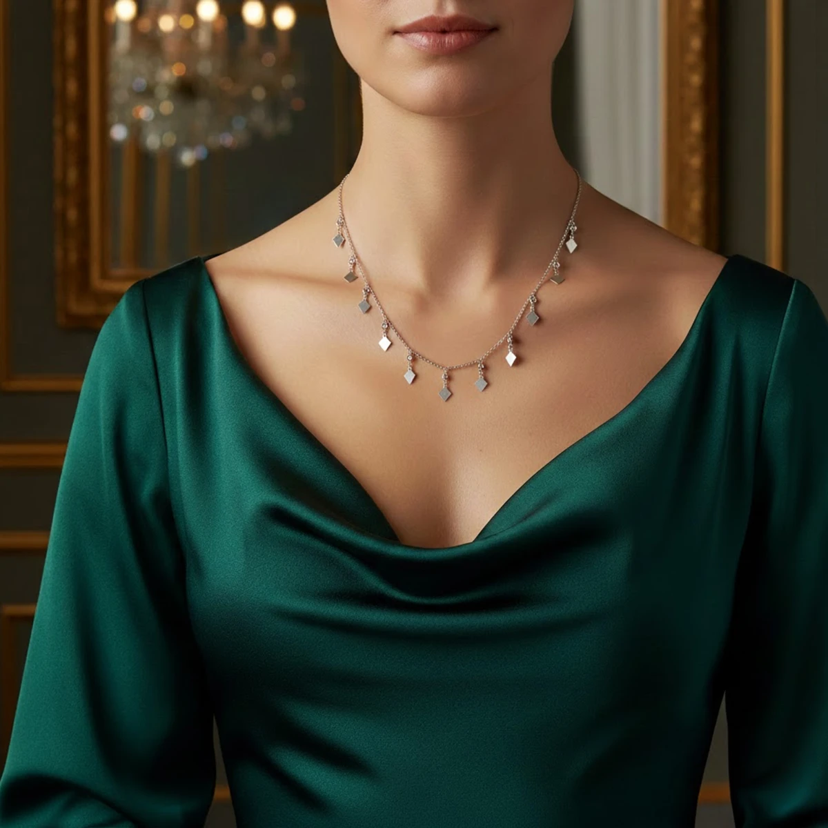 The Mañjarī chain features delicately polished rhombus-shaped charms arranged with perfect spacing for a graceful, playful movement. Its light and elegant design makes it ideal for adding a subtle sparkle to everyday looks or enhancing special occasions with refined charm.