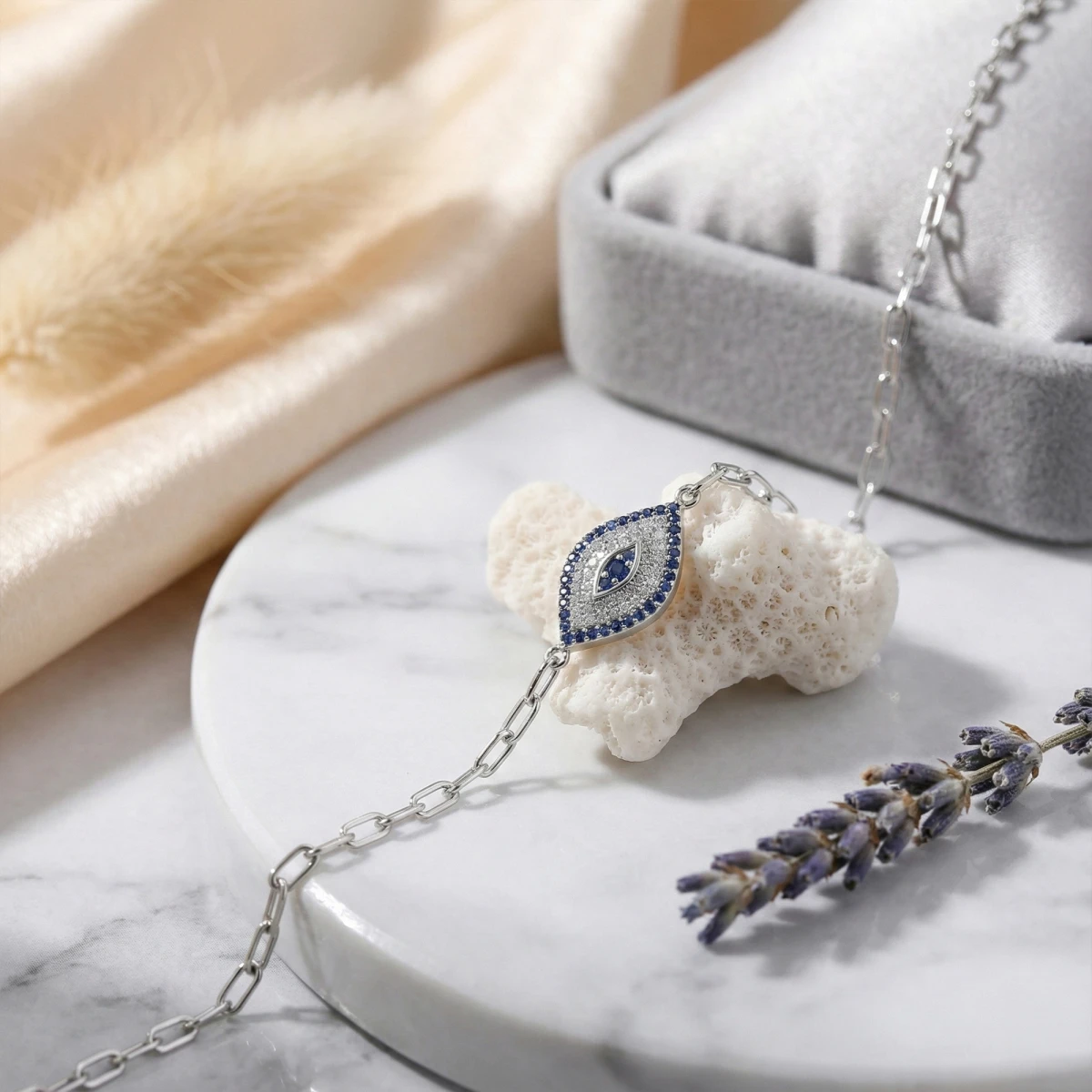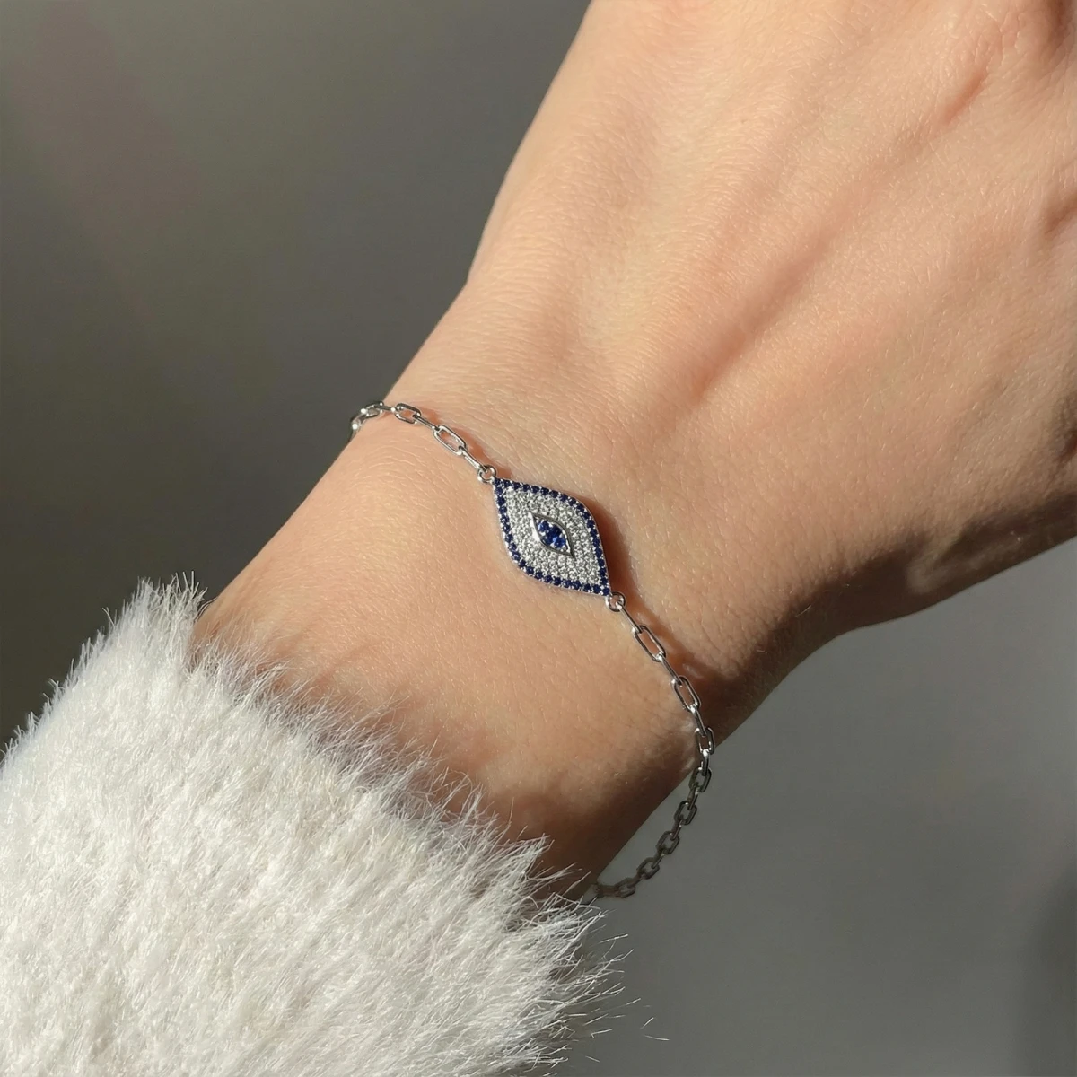 The Rakṣā-Kankaṇa bracelet features a striking silver evil eye charm in an elegant marquise shape. Half of the charm glimmers with white cubic zirconia, while the other half shines in deep blue tones. A symbol of protection and style, it’s perfect for everyday wear.