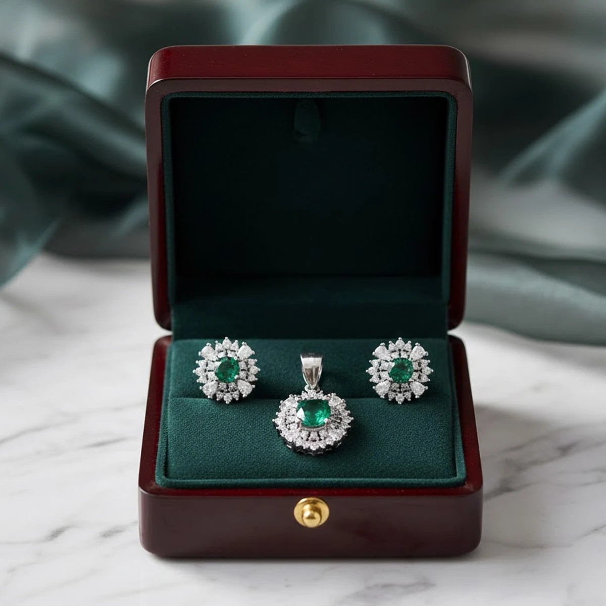 The Ratnapadī pendant set radiates timeless elegance with its silver-toned finish and graceful design. A vivid emerald-green stone forms the heart of each piece, encircled by a halo of sparkling white cubic zirconia. Complete with matching stud earrings, it’s perfect for both everyday charm and special occasions.