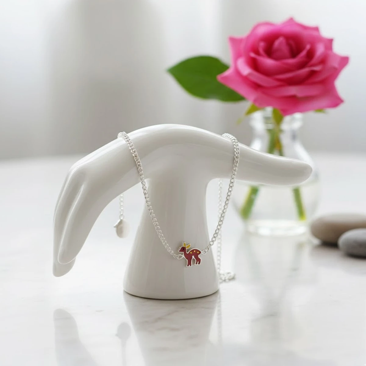 The Sukhavalaya bracelet is a delightful accessory designed for children, featuring a charming red deer with yellow antlers and spots at its center. Crafted on a sleek silver chain, it combines playfulness with gentle elegance. A perfect everyday piece for little ones.